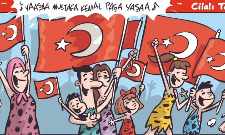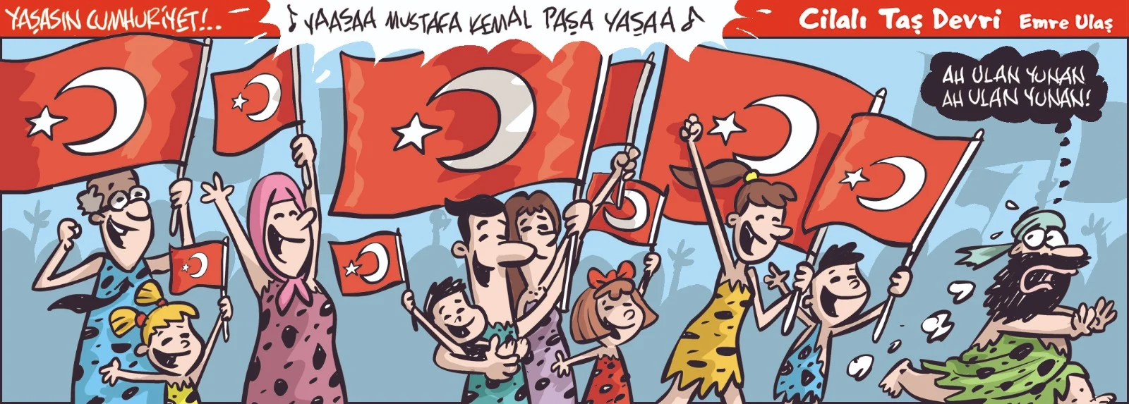 Emre Ulaş, “Yaşasın Cumhuriyet” başlığıyla çizdiği karikatürde; genç, yaşlı, çocuk tüm Türk milleti olarak Türkiye Cumhuriyeti’nin 100. Yılı coşkuyla kutlanırken, Yunan’dan medet uman, “Keşke Yunan galip gelseydi” diyen cumhuriyet düşmanlarını betimledi.Dört bir yanı savaşlar ve istikrarsızlıkla dolu coğrafyada bir ışık gibi parlayan, üzerimize güneş gibi doğan cumhuriyeti bize emanet eden Ulu Önder Gazi Mustafa Kemal Atatürk ve silah arkadaşlarını saygı ve minnetle yad ediyoruz. Yaşasın Cumhuriyet!