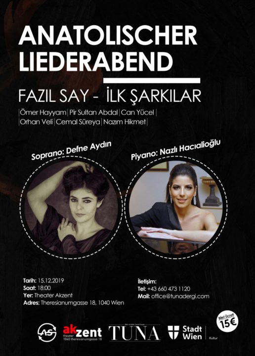 Aynı gün saat 18:00´de „Anatolischer Liederabend – Fazıl Say – İlk Şarkılar“ konseri kapsamında Avusturya’da sanat hayatını sürdürmekte olan Soprano Defne Aydın ve Piyanist Nazlı Hacıalioğlu Anadolu topraklarının eşsiz insanlık ve tarih birikimini, dünyaca ünlü piyanist Fazıl Say’ın ‘İlk Şarkılar’ isimli albümünden aktarılacak. Fazıl Say’ın ‘İlk Şarkılar’ isimli albümünden aranje ettiği, Ömer Hayyam, Can Yücel, Metin Altıok, Pir Sultan Abdal, Orhan Veli, Nazım Hikmet gibi değerlerimizin şiirlerini seslendirerek, Avusturyalı ve Avusturya’da yaşamakta olan Türk sanatseverlere aktaracaktır.