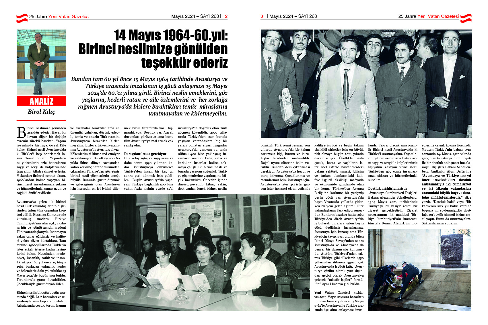 Yeni Vatan Gazetesi 15.Mayıs.2024 Mayıs sayısını basarken bundan tam 60 yıl önce, 15 Mayıs 1964’te Avusturya ile Türkiye arasında işe alım anlaşması imzalandı. Tekrar olacak ama önemli; Birinci nesil Avusturya’da ki Türkler’i unutmayalım. Yaşamlarını yitirenlerinin aziz hatıralarını saygı ve sevgi ile kalplerimizde taşıyalım. Yaşayan birinci nesil Türkie’den göç etmiş insanlarımıza şükran ve hürmetlerimizi sunalım.