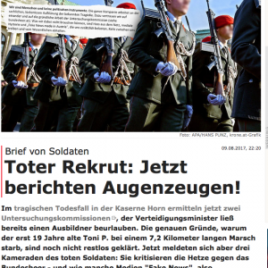 Orduda görev yapan bir asker olarak Temmuz ayında gerçekleştirilen Viyana Muhafız Alayı yürüyüşüne katılan 19 yaşındaki Toni P., başarılı bir matura öğrencisi ve su topu oyuncusuydu. Genç asker, geçen hafta, Aşağı Avusturya’nın Horn ilçesinde, temel eğitim döneminde hayatını kaybetti. Krems savcılığı emriyle gerçekleştirilen ön otopsi sonucu, gözleri orduya çevirdi. Zira ölüm nedeni, 37 derecelik hava sıcaklığı altında yapılan yürüyüş kaynaklı vücut ısısının aşırı yükselmesiydi. Kavurucu sıcak altındaki zorlu görevi nedeniyle 19 yaşındaki erin ateşi 44 dereceye çıkmıştı. Yapılan ön incelemelerde, herhangi bir bakteriyel hastalığın izine rastlanmadı.