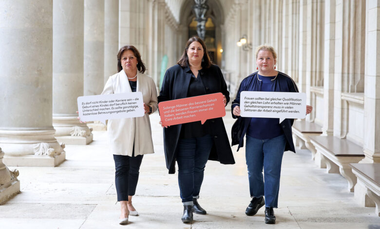 “Kadının bir saati erkeğin bir saati değildir. Kadınlar üzerindeki çoklu yükleri ve eşit ücret talebini vurgulamıştır. Hedefimiz ücret ve emeklilik farkını kapatmak!” diyen Viyana Belediye Başkan Yardımcısı Kathrin Gaál ( Resim/ortada), Avusturya İşçi Odası AK Başkanı Renate Anderl (solda) ve ÖGB Başkan Yardımcısı ve Kadın Başkanı Korinna Schumann (sağda) dikkat çekici açıklamalarda bulundular.