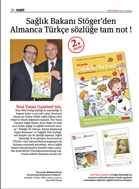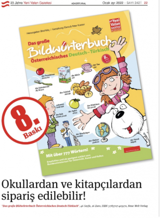 Neue Welt Verlag yayınevi ve Yeni Vatan Gazetesi'nin geliştirdiği eser, Avusturya'da yine bir ilki gerçekleştiriyor. Büyük resimli Avusturya Almancası-Türkçe sözlüğün yeni ve geliştirilmiş sekizinci baskısı Nisan 2022 ortasında piyasaya sürülüyor.