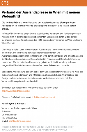 Avusturya Yabancı Basın Birliği’ne artık http://www.auslandspresse.at adresinden ulaşabilirsiniz.