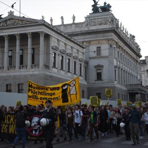Polisin geniş güvenlik önlemi aldığı gösteride “Kickl istifa“, „Müslümanlar ve sığınmacılar hoş geldiniz“, „Yönetimde Nazilere hayır” yazılı pankartlar açıldı.