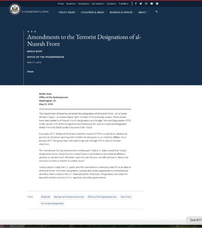 Amerikan Dışişleri Bakanlığı, Suriye’deki El Kaide bağlantılı Nusra Cephesi’nin tanımına Hay’at Tahrir al-Sham (HTS) ve diğer takma adları eklemek suretiyle değişiklik yapmıştır. Bu takma adlar, Göç ve Vatandaşlık Yasası’nın 219. maddesi uyarınca Yabancı Terörist Örgüt (FTO) ve 13224 sayılı Başkanlık Kararnamesi uyarınca Özel Olarak Belirlenmiş Küresel Terörist (SDGT) olarak Nusra Cephesi’nin tanımlarına eklenmiştir.