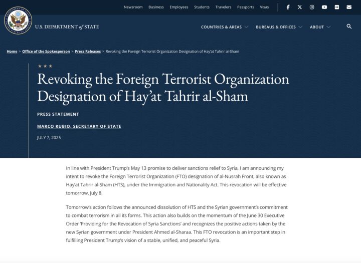 VAŞİNGTON. ABD Trump hükümeti, Suriye Geçiş Dönemi Cumhurbaşkanı Ahmed Şara’nın lideri olduğu Heyet Tahrir Şam’ı (HTŞ) „yabancı terör örgütleri“ listesinden dün, 7 Temmuz 2025’te resmen çıkardığını, anlamlı bir ziyaretçi olan İsrail Başbakanı Netanyahu’nun Amerikan Başkanı Trump ile görüşme arifesinde açıkladı.