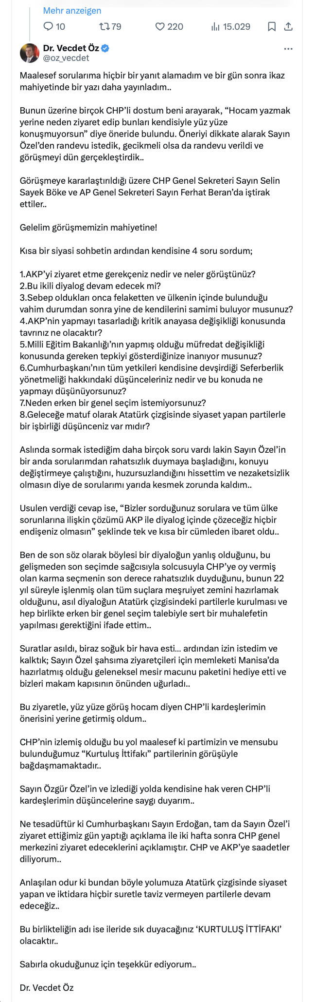 Sayın Özgür Özel’in ve izlediği yolda kendisine hak veren CHP’li kardeşlerimin düşüncelerine saygı duyarım..
