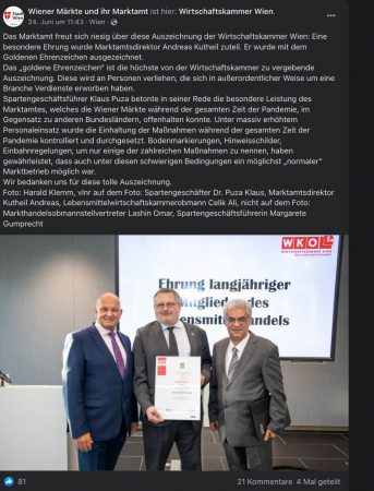 Yönetim Kurulu Başkanı Ali Çelik yaptığı konuşmada, diğer federal eyaletlerin aksine Viyana pazarlarını salgın boyunca açık tutabilen pazar ofisinin özel başarısını vurguladı. Salgın boyunca personel artışıyla birlikte önlemlere eksiksiz uyulduğuna dikkat çeken Çelik, büyük bir özveriyle pazarın bu zor koşullar altında bile mümkün olduğu kadar “normal” bir şekilde işlemeye devam ettiğini ifade etti.