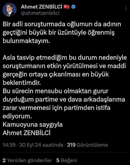 Olayın ardından AKP Adana Milletvekili Ahmet Zenbilci, bugün yaptığı yazılı açıklamayla istifa etti. İstifa gerekçesi olarak ise „bir adli soruşturmada oğlunun da adının geçmesini“ gösterdi. „Asla tasvip etmediğim bu durum nedeniyle soruşturmanın etkin yürütülmesi ve maddi gerçeğin ortaya çıkarılması en büyük beklentimdir“ diyen Zenbilci, bu sürecin partisine zarar vermemesi için istifa ettiğini bildirdi.