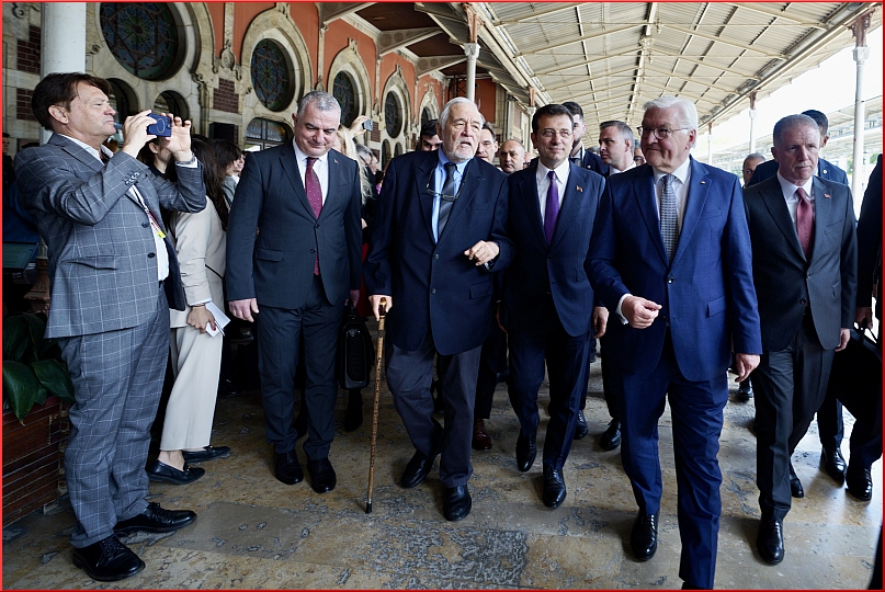 Ali YILDIRIM / AYPA– Sirkeci / İSTANBUL. Cumhuriyet Halk Partisi (CHP) TBMM Grup Başkanvekili Gökhan Günaydın ve İstanbul Büyükşehir Belediye (İBB) Başkanı Ekrem İmamoğlu, 63 yıl önce Almanya’ya iş gücü göçünün başladığı nokta olan Sirkeci Tren Garı’nda, Almanya Federal Cumhurbaşkanı Dr. Frank-Walter Steinmeier’i karşıladı. Cumhurbaşkanı Steinmeier ve İmamoğlu, karşılama sonrasında basın mensuplarına ziyaret anısına poz verdi. Cumhurbaşkanı Steinmeier, Almanya Federal Cumhuriyeti İstanbul Başkonsolosu Johannes Regenbrecht ile birlikte, İmamoğlu liderliğindeki İBB heyetiyle, tarihi Orient Express Lokantasında, basına kapalı bir toplantı gerçekleştirdi. Toplantının ardından Cumhurbaşkanı Steinmeier ve İmamoğlu, kendilerine dahil olan İstanbul Valisi Davut Gül ile birlikte, “Demiryolu Müzesi”ni ziyaret etti. Müzeyi ünlü tarihçi İlber Ortaylı’nın anlatımıyla gezen heyet, “Almanya’ya Türk İşçilerin Göçü” temalı sergi ile Türk kadın işçiler ve onların müziklerini konu alan “Gurbette Hasret” sergisini de ziyaret ederek, Almanya’ya göçün görsel hafızasını deneyimledi.