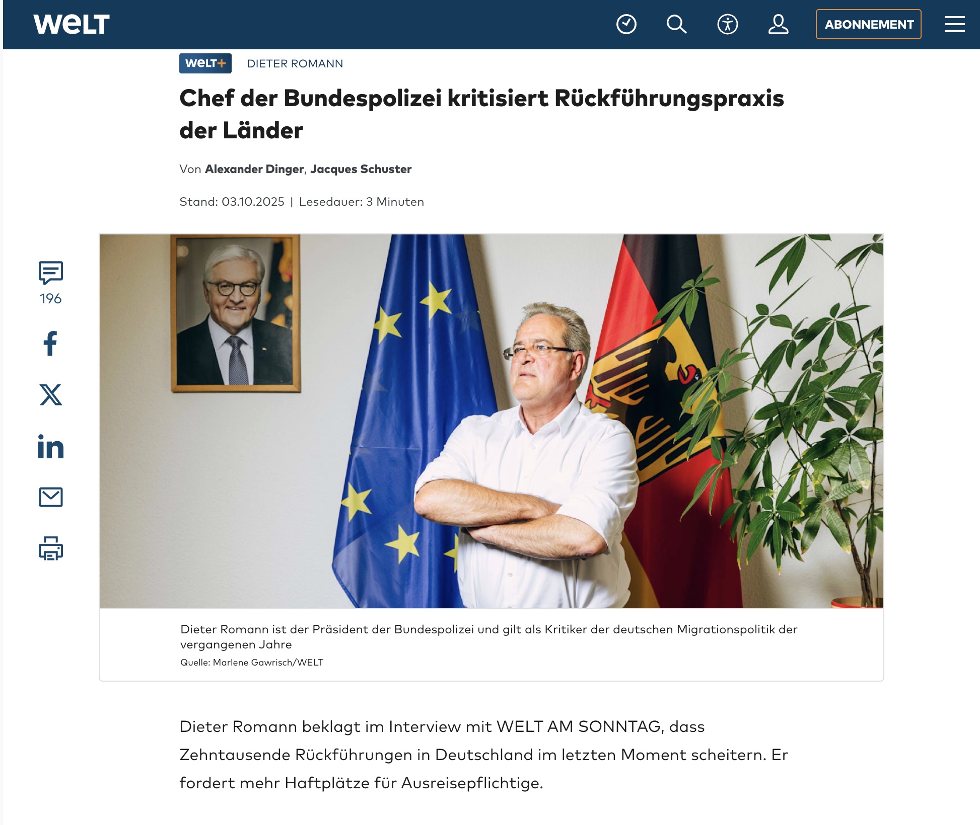 Almanya Federal Polis Başkanı Dieter Romann,Almanya’daki sınır dışı sistemini sert şekilde eleştirdi: 2024’te 30.000’den fazla işlem, polis müdahale edemeden iptal edildi.