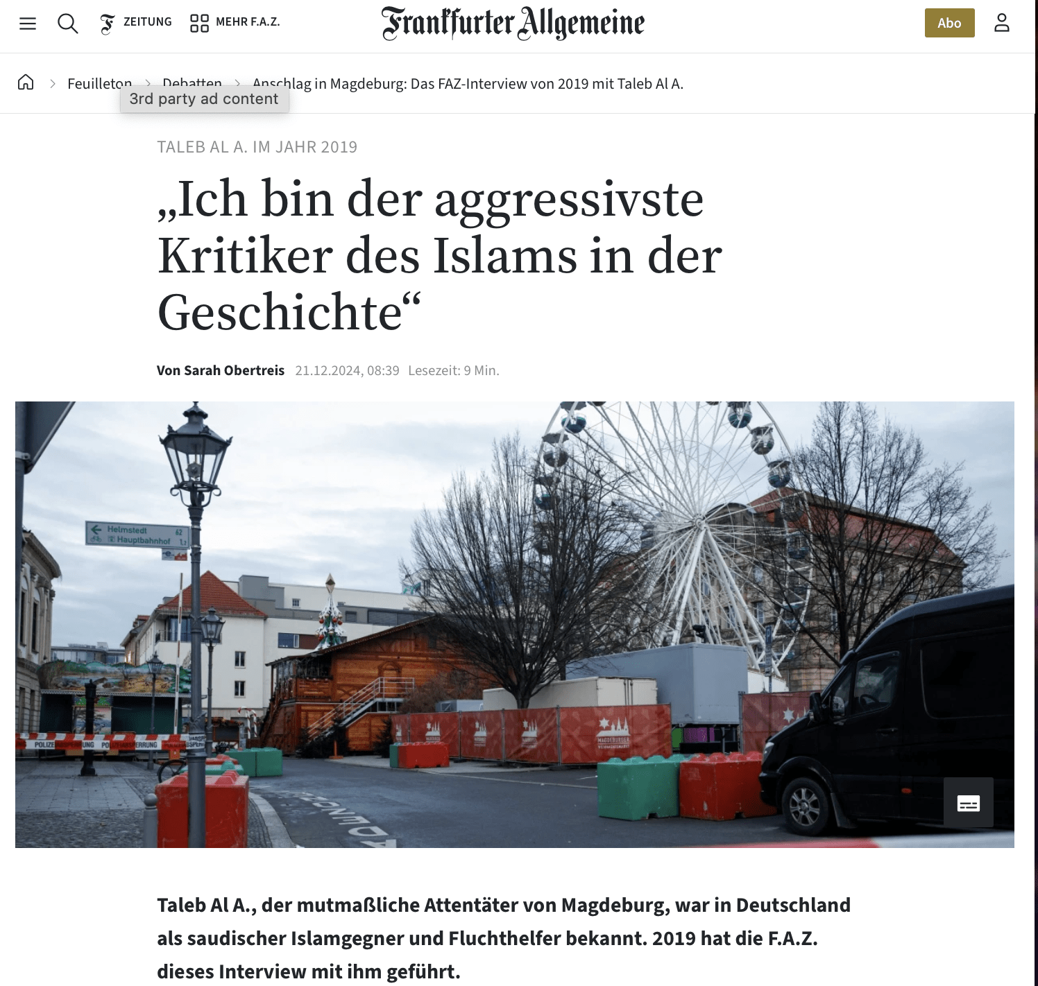 Magdeburg’daki şüpheli saldırgan Taleb Al A. Almanya’da Suudi bir İslam karşıtı ve kaçış savaşçısı olarak biliniyordu. F.A.Z. 2019 yılında kendisiyle bu röportajı gerçekleştirdi.