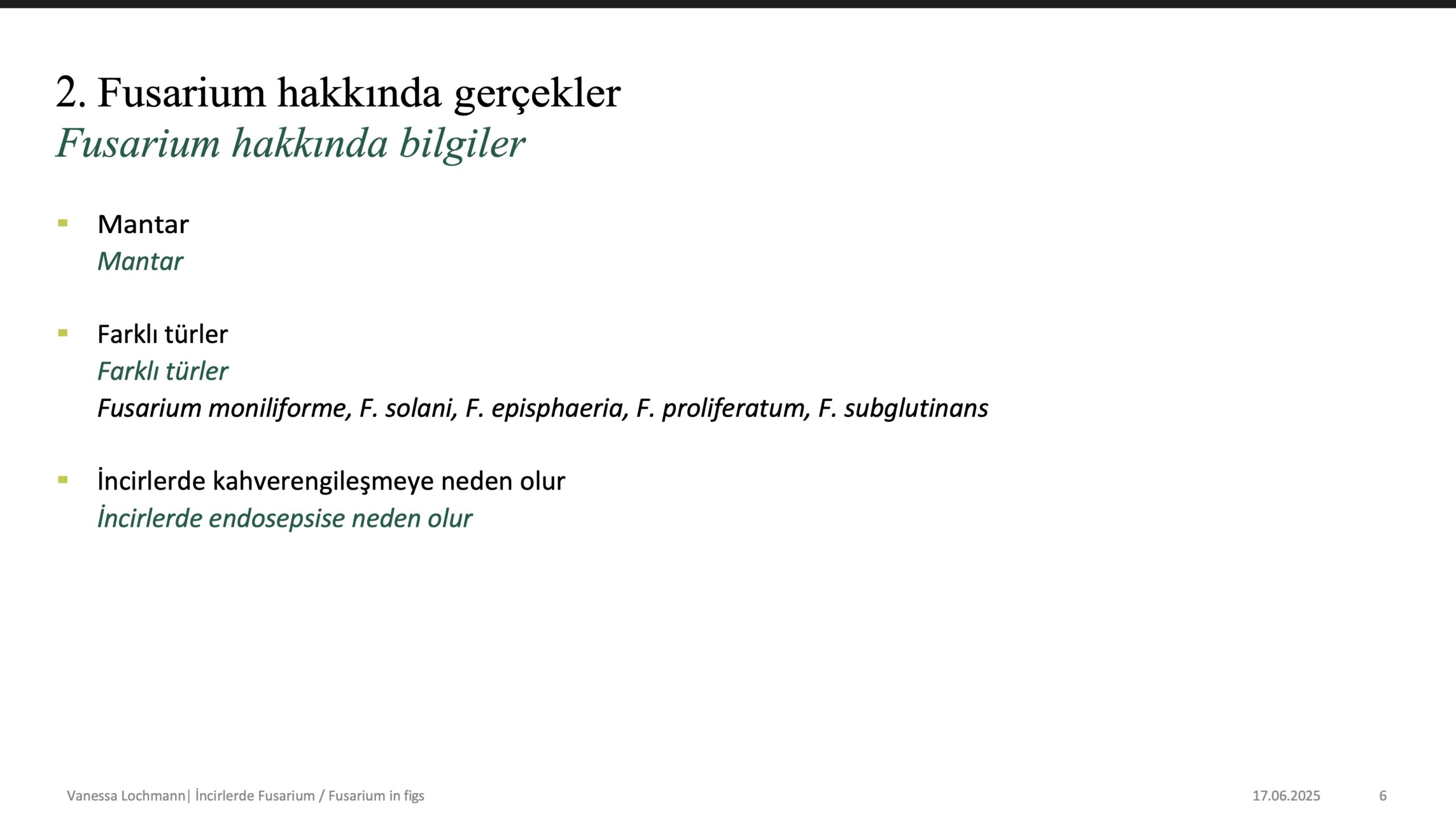 1.  Bundesanstalt für Landwirtschaft und Ernährung. Lochmann, V. (17.06.2025). Fusarium bei Feigen / Fusarium in figs. Bonn. Türkçe tercüme