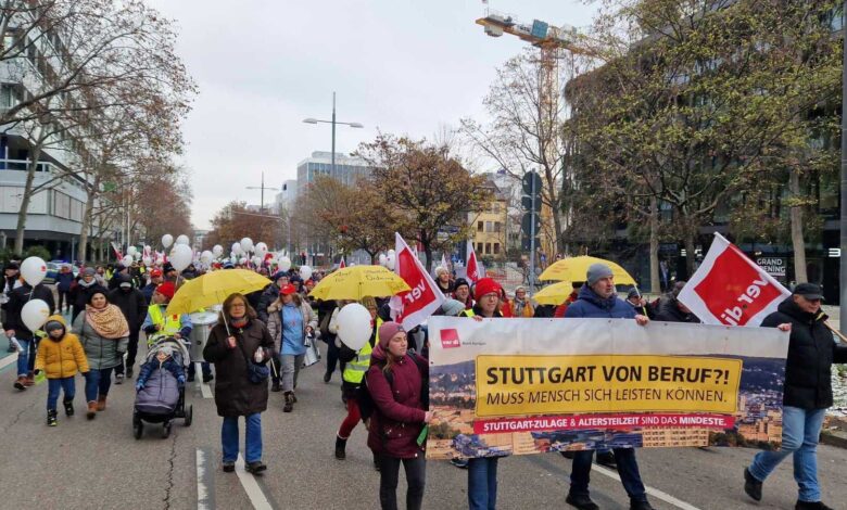 Eyalet başkenti Stuttgart’ta Ver.di sendikası iki gün peş peşe grev çağrıları yaptı. İlk uyarı pazartesi sabah saat 7’de başladı. Kreş, gençlik evleri, okul ve belediye çalışanlarının dahil olduğu uyarı grevine iki bin kişi katıldı. Sendika binasında yapılan tartışmalar ve hazırlıklar sonrası dondurucu havada yürüyüş başladı. Baden-Württemberg Belediye İşverenleri Birliğinin (KAV) toplantısını protesto etmek, taleplerinin dikkate alınması için baskılamak için Stuttgart belediye binasına gelindi. Önce belediyenin etrafında sloganlar atılarak yüründü. Ardından burada bir miting düzenlendi. Sendikacı ve temsilciler konuşmalar yaparak taleplerinde kararlı olduklarını dile getirdi. Daha sonra yüzlerce kişi belediye binasına girerek sloganlar attı. İçerden gelen ve işveren örgütünün bir karar almadan toplantıyı bir gün sonrasına ertelediği haberiyle protestolar daha da çoğaldı.