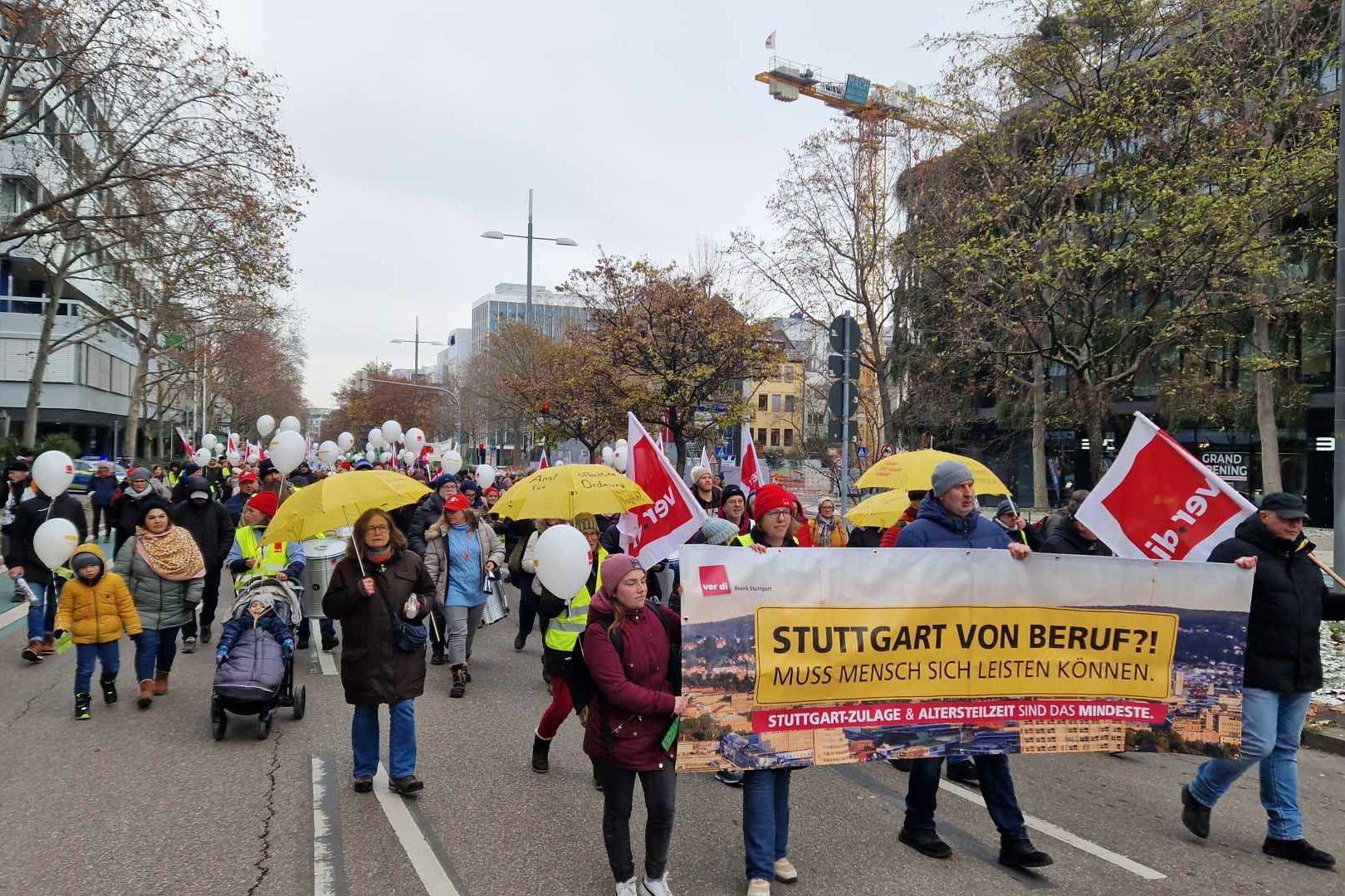 Eyalet başkenti Stuttgart’ta Ver.di sendikası iki gün peş peşe grev çağrıları yaptı. İlk uyarı pazartesi sabah saat 7’de başladı. Kreş, gençlik evleri, okul ve belediye çalışanlarının dahil olduğu uyarı grevine iki bin kişi katıldı. Sendika binasında yapılan tartışmalar ve hazırlıklar sonrası dondurucu havada yürüyüş başladı. Baden-Württemberg Belediye İşverenleri Birliğinin (KAV) toplantısını protesto etmek, taleplerinin dikkate alınması için baskılamak için Stuttgart belediye binasına gelindi. Önce belediyenin etrafında sloganlar atılarak yüründü. Ardından burada bir miting düzenlendi. Sendikacı ve temsilciler konuşmalar yaparak taleplerinde kararlı olduklarını dile getirdi. Daha sonra yüzlerce kişi belediye binasına girerek sloganlar attı. İçerden gelen ve işveren örgütünün bir karar almadan toplantıyı bir gün sonrasına ertelediği haberiyle protestolar daha da çoğaldı.