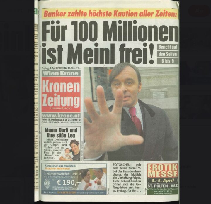 Viyana. Julius Meinl V.’in hapsedilmesi 15 yıl önce “Rekor kefalet dahil olmak üzere tutuklu yargılama: 100 milyon Euro. Para aktı. Meinl 48 saat hapis yattı” gibi başlıklarla manşetlere taşınmıştı.