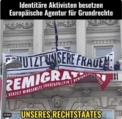 VİYANA. Almanya’yı geçtiğimiz ay karıştıran „Kimlikçiler“ İdentitäre’nin ve eski liderleri Martin Sellner Pazar sabahı Viyana’daki Schwarzenbergplatz’da bulunan Avrupa Temel Haklar Ajansı’nın balkonunu resmen işgal etti. „Yeniden göç“ ve „Kadınlarımızı koruyun“ yazılı afişler asılırken, Sellner ve diğer aşırı sağcı aktivistlerin megafonla konuşmalarda , “ Kimlikçi aktivistler Viyana’daki Avrupa Birliği Temel Haklar Ajansı’nın balkonunu işgal etti 🇦🇹 Aktivistler AİHS’den çekilmeyi, iltica hakkının askıya alınmasını, sınırda geri itme uygulamasını, Kuzey Afrika’da model şehirler kurulmasını, Leitkultur ve geri dönüş programlarını talep ediyor.“ denildi görüldü.