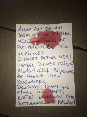 ANKARA. Tekirdağ’ın Marmara Ereğlisi ilçesinde 3 okulda bulunan bir Atatürk heykeli ile 2 büstüne boyayla hakaret içerikli yazılar yazan şüphelinin yakalanması için polis ve jandarma tarafından özel ekip oluşturuldu. İki yıl önce meydana gelen 5.8 büyüklüğündeki depremde Yeniçiftlik Mahallesi’nde bulunan Nizamettin Demirdöven İlkokulu’nun kirişlerinde ağır hasar meydana geldiği için boşaltıldı. Kullanılmadığı öğrenilen Nizamettin Demirdöven İlkokulu ile aynı mahallede bulunan Yeniçiftlik Belediye Ortaokulu ve ilçe merkezindeki Opet Anadolu Lisesi’nin bahçelerinde bulunan Atatürk heykeliyle büstlerine ve duvarlara kimliği belirsiz kişi ya da kişiler tarafından boyayla hakaret içerikli yazılar yazıldı.