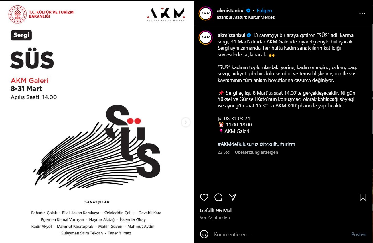 İstanbul Taksim Meydanı’ndaki Atatürk Kültür Merkezi’nde (AKM) 8 Mart’a özel hazırlanan ‘SÜS’ sergisinde yalnızca 13 erkek sanatçının eserinin yer alması eleştirilere neden oldu.