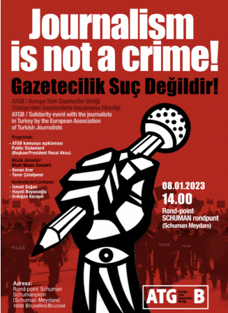 ATGB’nin yaptığı açıklamada şu ifadelere yer verildi : “ 2002 yılından beri Avrupa çapında faaliyet gösteren ATGB, tüm dünyaya “Gazetecilik suç değildir” başlığı ile haykıracak ve Türkiye’deki gazetecilerin yalnız olmadıklarını görmesini sağlayacak. “Türkiye’de medyanın hükümet kontrolüne girdiği, bağımsız ve özgür gazetecilerin yeni sansür yasasıyla susturulduğu bir ortamda bizler sessiz kalamaz, susamazdık. 8 Ocak saat 14.00’de Schuman Meydanı’ndayız.” diyen ATGB yöneticileri Avrupa’daki tüm demokratları Brüksel’deki etkinliğe katılmaya çağırıyoruz. Sanatçılar Kenan Erer ve Tanar Çatalpınar’ın müzikleriyle renklendirdiği etkinlikte basın özgürlüğüne dikkat çeken çeşitli pankartlar ve birlik üyesi karikatüristler Erdoğan Karayel, Hayati Boyacıoğlu ve İsmail Doğan’ın karikatürleri ellerde taşınırken, gazeteciler de sansüre karşı mücadeleyi gösteren minik bir tiyatral performans canlandıracaklar.“