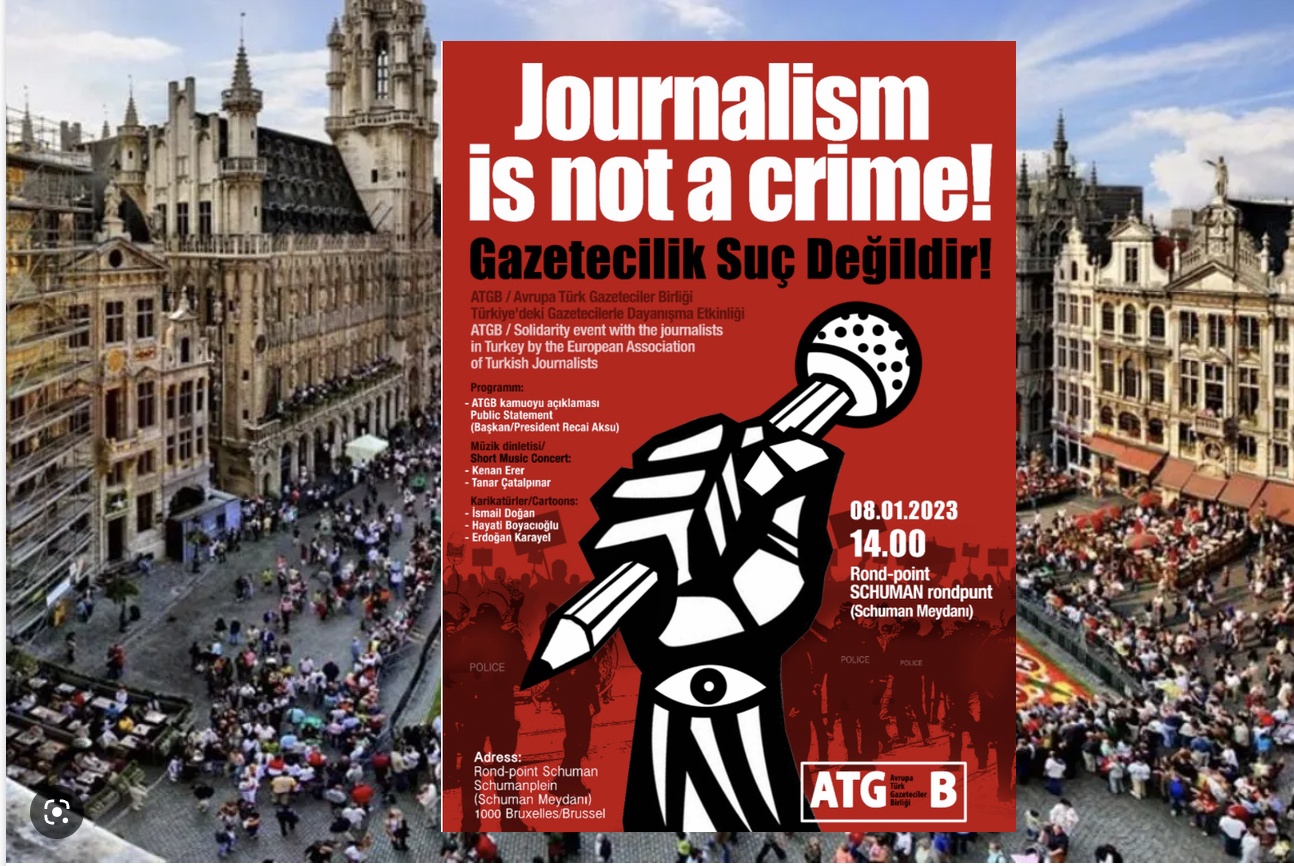 BRÜKSEL. Kısa adı ATGB olan „Avrupa Türk Gazeteciler Birliği“ 8 Ocak tarihinde Brüksel’de Avrupa Birliği Komisyon binasının arkasındaki ve AB binalarının ortasında buluna ünlü Schuman Meydanı’nda , “Türkiye’deki basın özgürlüğü ihlalleri ve yeni sansür yasasına” tepki göstermek amacıyla “Gazetecilik Suç Değildir” adı altında bir etkinlik düzenliyor.