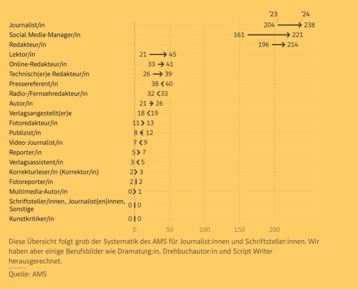 AMS, gazetecileri ve yazarları, senaristleri, dramaturgları ve senaryo yazarlarını da içeren bir meslek grubunda toplamaktadır. Bu grupları STANDARD’ın gazetecilik sektöründeki işsizlikle ilgili aylık genel değerlendirmesinin dışında tuttuk. Yazarların yanı sıra düzeltmenler ve teknik editörler de listelenmiştir. Sosyal medya yöneticileri, AMS sisteminde gazetecilik medya sektörüne net bir şekilde atfedilemeyen ve kesin olarak dışlanamayan nispeten büyük bir gruptur.