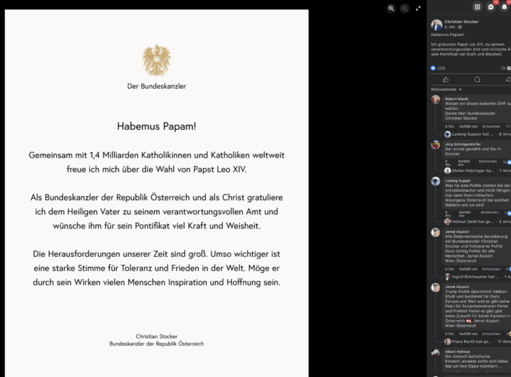 Kısa adı ÖVP olan Avusturya Hristiyan Demokratik Partisi'nden olan Başbakan Christian Stocker, yeni Papa XIV. Leo'nun seçilmesinden dolayı adeta başbakan olduğunu ve SPÖ ile NEOS ile koalisyon hükümeti kurduğunu unutarak, resmi Başbakanlık antetli kağıdını kullanarak ünlü Latince "Habemus Papam" (Bir Papa'mız) başlığıyla bir kutlama mesajı yayınladı ve bunu kendi Facebook ve X sosyal medyasından kamuoyuyla paylaştı.