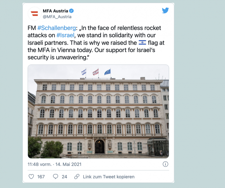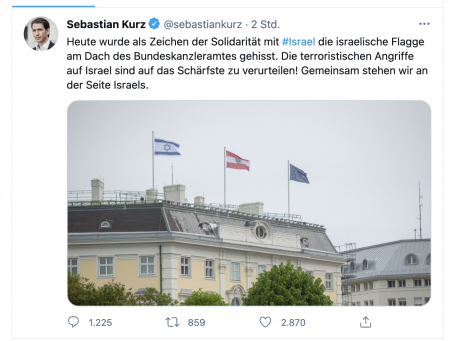 Viyana.Başbakan Sebastian Kurz (ÖVP) tarafından paylaşılan bir tweet ile paylaşılan resimde şu ifadeler yazıldı: “ Avusturya Başbakanlığı‘ nın çatısına astığımız bu İsrail Bayrağı ile İsrail dayanışma içinde olduğumuzu ilan ediyoruz. İsrail’e yönelik terör eylemlerini şiddetle kınıyoruz. Hep birlikte İsrail‘ in yanındayız“