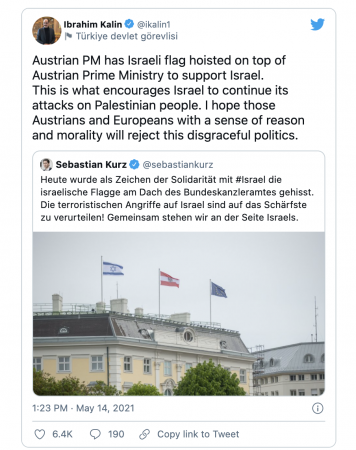 Avusturya’nın İsrail bayrağı çekerek dayanışma ifadeleri Türkiye’den şiddetli eleştirilere neden oldu. Türkiye Cumhurbaşkanı Recep Tayyip Erdoğan’ın sözcüsü İbrahim Kalın Twitter’da İsrail bayrağını çekmenin „ahlaki olmadığını“ yazdıktan sonra şunları ifade etti: „Avusturyalılar „utanç verici siyaseti“ reddetmeli Türkiye zaten „Avusturya ile gergin ilişkiler“ içindedir ve Ortadoğu çatışmasında „açıkça“ Filistinlileri desteklemektedir. Ayrıca Avusturyalıların „sağduyu ve ahlak duygusuyla bu utanç verici politikayı reddedeceğini“ umuyoruz.“