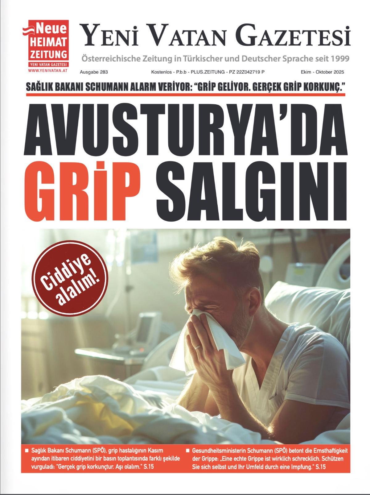 “Gerçekten korkunç”: Bakan hastalık konusunda uyarıyorAvusturya Sosyal İşler Bakanlığı, ülke genelinde başlattığı bir kampanya ile ücretsiz grip (influenza) aşısını tanıtıyor ve koruma seçeneklerini genişletiyor. Avusturya Sosyal İşler Bakanlığı, 2025 grip sezonu için ücretsiz influenza aşısı kampanyası başlattı. 60 yaş üstü ve risk grupları için zona ve pnömokok aşıları da ücretsiz uygulanacak.