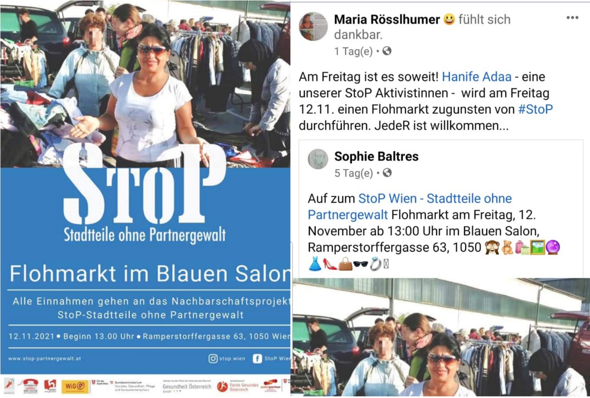 Tüm gelirlerinin yardımcı kuruluş projesi olan StoP’a aktarılacağı “Flohmarkt”, 12 Kasım Cuma günü saat 13.00 itibariyle 5. Viyana’da gerçekleşecek. StoP aktivistlerinden biri olan Hanife Ada, söz konusu Flohmarkt’ı, Viyana’nın beşinci bölgesinde yer alan Ramperstorffergasse 63’te Blauen Salon’da kuracak. ( yenivatan.at. 10.11.2021)