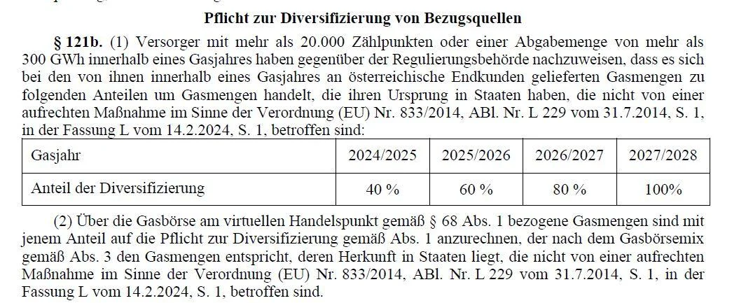 Kurier Gazetesi’nin verdiği habere  göre yasa taslağı o zamandan beri koalisyon ortağı ÖVP ‚ye gönderildi.  Taslak, Gaz Endüstrisi Kanunu, Gaz Çeşitlendirme Kanunu ve Enerji Yönlendirme Kanunu’nda değişiklikler içermekte olduğu görüldü.