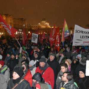 Viyana’daki Westbahnhof tren garı önünde toplanan göstericiler, „Hükümet bu ülke için utanç”, “Aşırı sağcı hükümete hayır” ve “Nazilere hayır” yazılı pankartlar açtı.