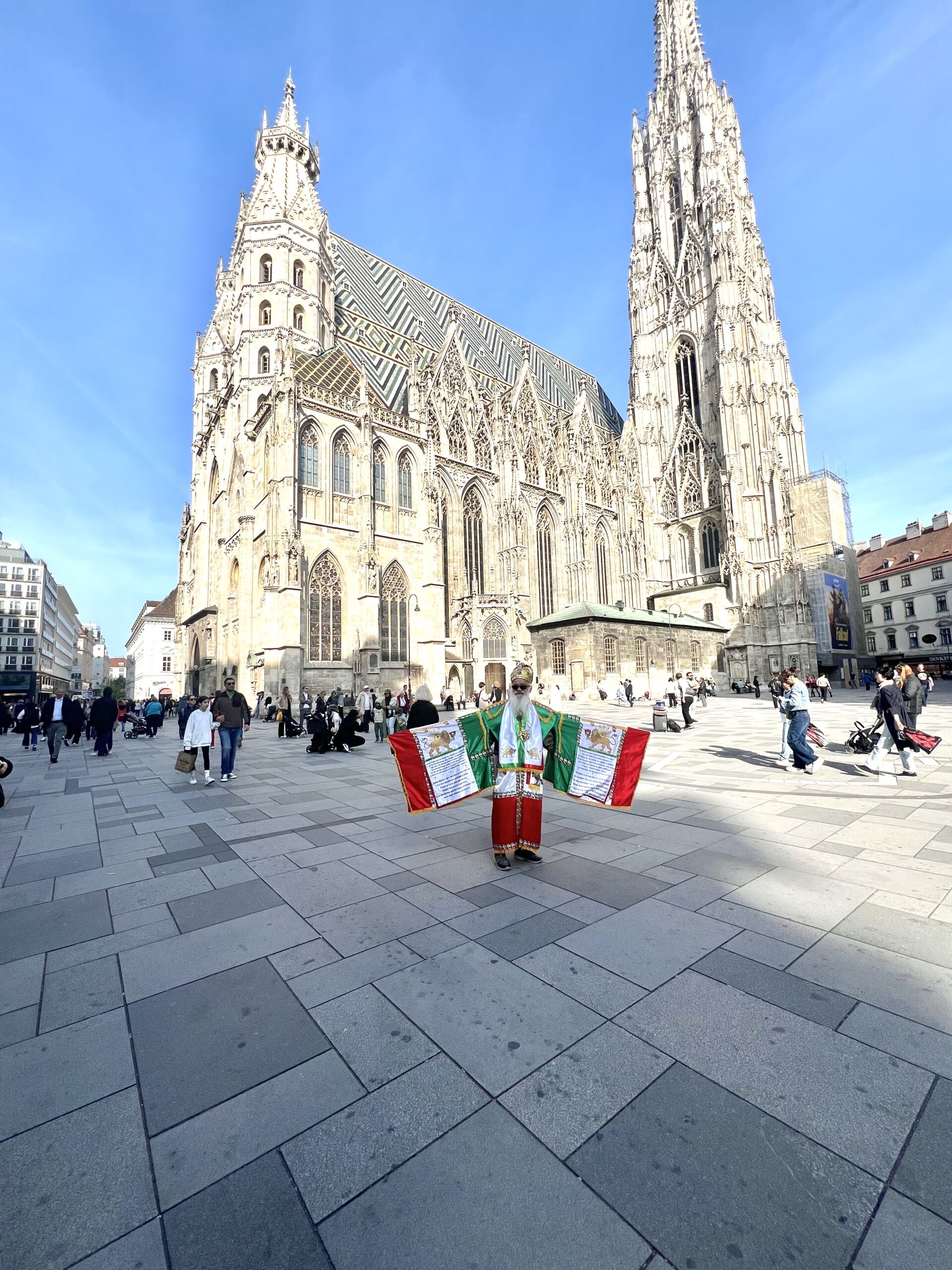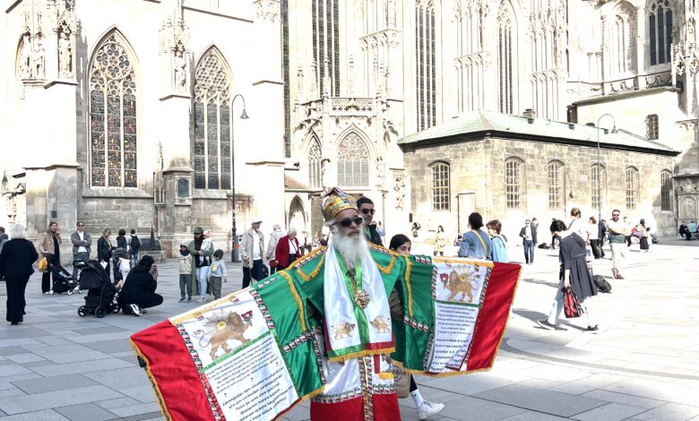 Viyana’nın ünlü merkez kilisesi sayılan Aziz Stephan Katedrali („Stephansdom“) önünde bu yaşlı ve sempatik sakallı yaşlı insanı görünce yanına gittim. Ellerini iki tarafa açmış ve arkası önü aslanlarla dolu ipeğimsi yeşil, beyaz ve kırmızı renkli bezler ve kafasında bir taç ile bilge bir kral gibi duran insan ne mesaj vermek istiyor diye merak ettim.