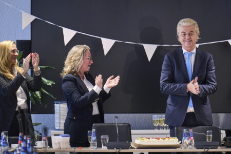 Geert Wilders (sağda), sağ liberal VDD’den Dilan Yeşilgöz (ortada), merkez sağ NSC partisinden Pieter Omtzigt (solda) ve Yurttaş Çiftçiler Hareketi’nden (BBB) Caroline van der Plas’ın yer aldığı dört partili bir koalisyon kurdu. Geert Wilders birinci parti seçilmesine rağmen Hollanda’da Başbakanlık görevinden feragat etti.