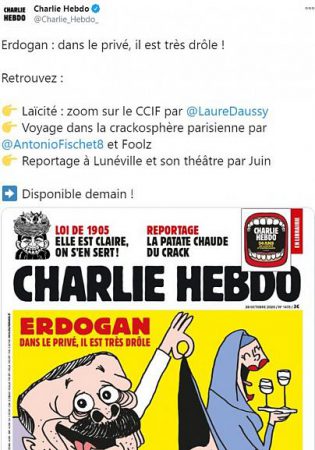 Fransa Cumhurbaşkanı Emmanuel Macron, Hz. Muhammed’e (s.a.v) hakaret içeren karikatürleri devlet binalarına yansıtmış, hatta lise kitapçıklarında karikatürün yer alması için talimat vermişti. Bunun üzerine Cumhurbaşkanı Erdoğan, Fransız mallarını boykot çağrısında bulunmuştu. Dergi de bu hamlenin ardından Cumhurbaşkanı Erdoğan’ı hedef alan bir kapakla yayın yaptı.
