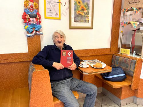 Son altı yıldır merhabalaşıp sohbet ettiğimiz Friedrich Hörçeki adlı, Avusturya’nın Burgenland eyaletinde doğmuş, son derece entelektüel ve akıllı 91 yaşındaki değerli arkadaşımıza, sayın İsmail Tosun SARAL’ın yayın evimiz tarafından ikinci baskısı yapılan “Kırmızı Beyaz Kırmızı-Rot Weiß Rot” adlı kıymetli eserini, bugün küçük bir Viyana fırınında ayak üstü hediye ettik.