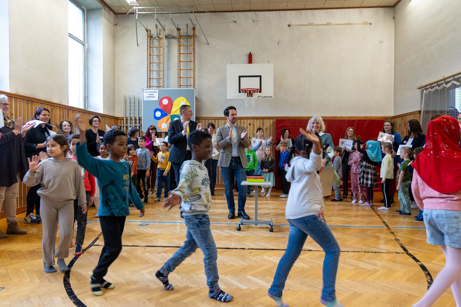 Münnichplatz 6’da yer alan Münnichplatz İlkokulu’nda gerçekleşen açılış töreninde danslar, şarkılar ve kutlamalarla dolu coşkulu bir atmosfer vardı. Tüm gün eğitim veren okulun öğrencilerinin coşkuyla sergilediği „Ein Hoch auf uns“ dansı dikkat çekerken, Pantuekgasse tam gün ilkokulu „Werden wir Freunde“ şarkısını seslendirdi. Hoefftgasse ilkokulundan çocuklar da „Sambra, Rumba, Cha-Cha-Cha“ şarkısını seslendirerek dans ettiler. Okul önünde sergilenen bu performanslar çocukların neşesini yansıtırken, topluluk duygusunu ve mahallenin çocuklar için olumlu bir geleceğin ortak arayışını vurguladı.