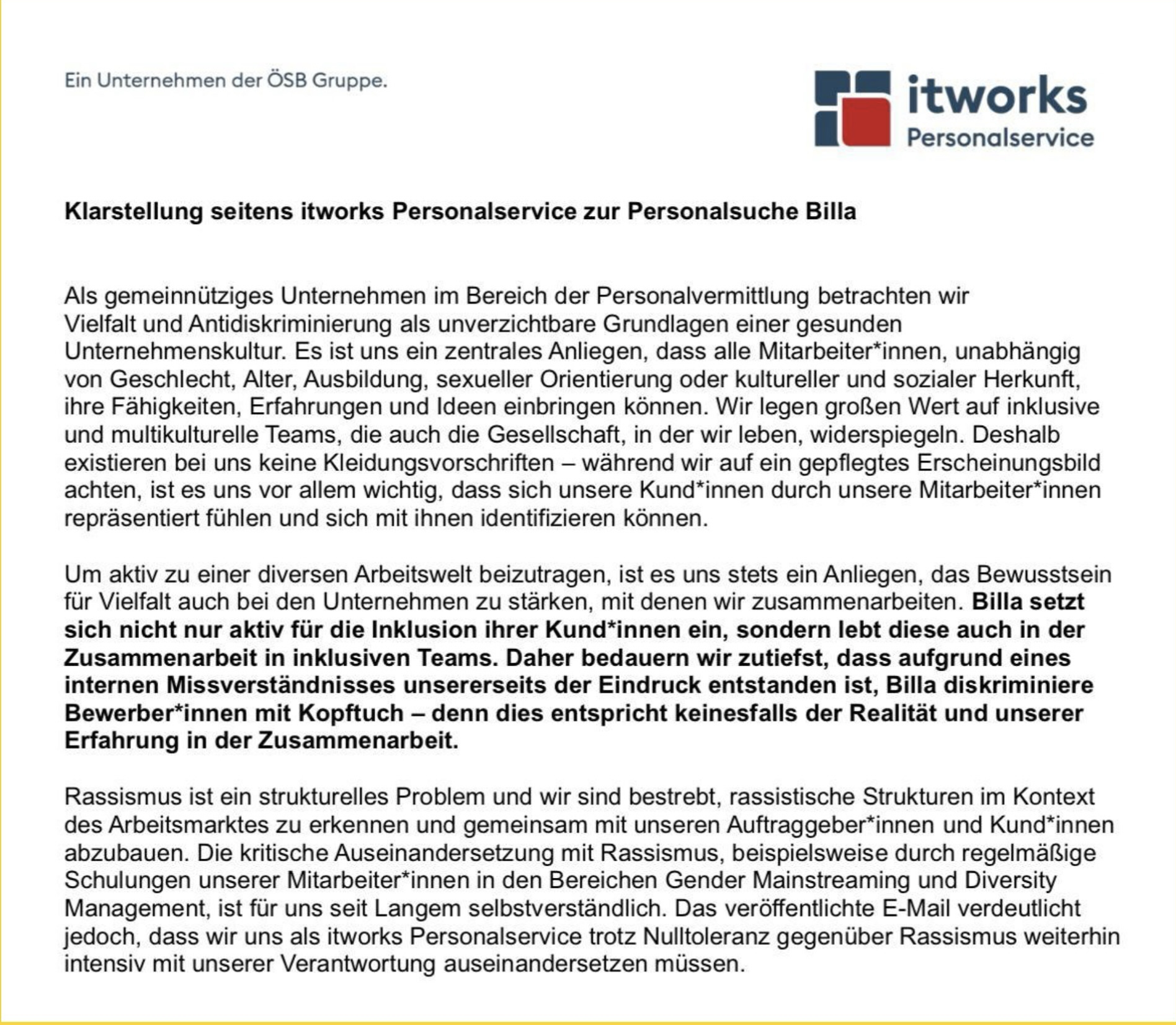 Şirket kapsayıcı ve çok kültürlü ekiplere büyük önem vermektedir ve ayrımcı dil „bizim tarafımızdan bir iç yanlış anlamadır „Billa’nın başörtülü adaylara karşı ayrımcılık yaptığı izleniminin yaratılmış olmasından“ üzüntü duymaktayız.“ dedi. (Murat Yıldırım, Viyana, 23.03.2024, yenivatan.at)