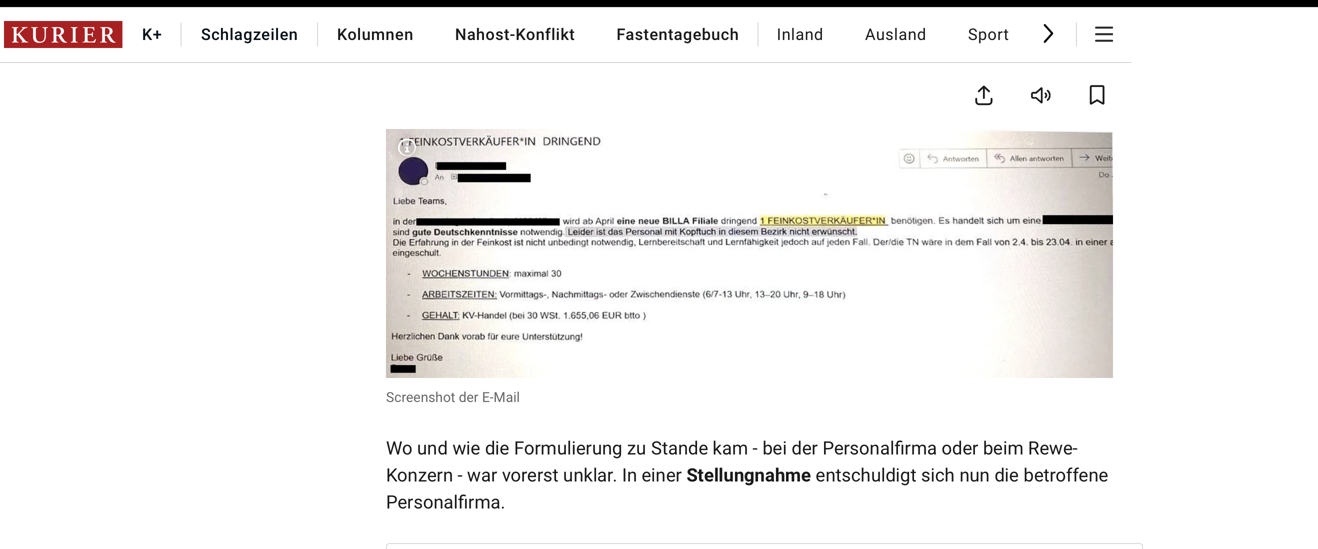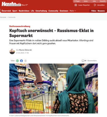 Heute Gazetesi haberin detayını şöyle verdi: „Büyük bir süpermarket zincirinden gelen dahili bir e-posta sosyal medyada oldukça heyecan yaratıyor. Viyana-Döbling’deki bir Billa şubesinden bahsediyoruz – şu anda bir şarküteri çalışanı arıyorlar. Haftalık çalışma saati en fazla 30 saat olacak. Maaş, olağan toplu sözleşmeye dayanmaktadır – yaklaşık 1.650 Euro brüt. Şarküteri departmanında deneyim şart değil, ancak çalışanın öğrenme yeteneği ve iyi Almanca dil becerileri özellikle önemlidir. Döbling’de başörtüsü „istenmiyor“ Bununla birlikte, mesajda bir alt maddede açık bir dışlama kriteri yer almaktadır: „Maalesef, başörtülü personel bu bölgede istenmemektedir.“ E-postanın „Uluslararası Irkçılıkla Mücadele Günü „nde yayınlanması sosyal medyada büyük tepkiye yol açtı.“