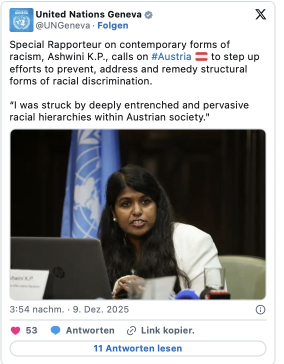 Ashwini, üç yıldır BM İnsan Hakları Konseyi’nde ırkçılık, ayrımcılık, yabancı düşmanlığı ve hoşgörüsüzlük konularında özel raportör olarak görev yapıyor. Aralık ayının başında bir haftalığına Avusturya’yı ziyaret eden raportör; Viyana, Graz ve Salzburg’da hükümet temsilcileri, resmi kurumlar, STK’lar ve ayrımcılık mağdurlarıyla görüştü. Ayrıntılı ülke raporunu Temmuz 2026’da BM İnsan Hakları Konseyi’ne sunmayı planlıyor.