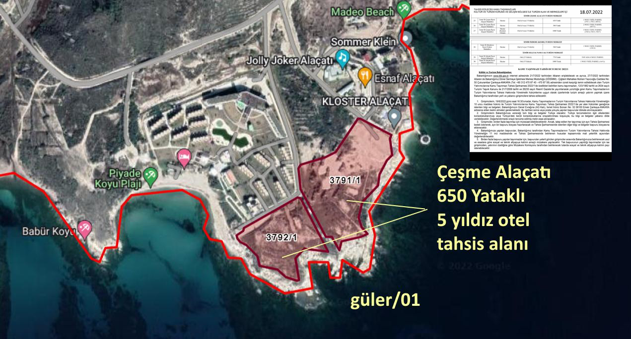 „Çeşme Alaçatı’da denize sıfır 3 değerli kupon arazi yerli ve yabancı turizmciye tahsis edilecek.. Kültür ve Turizm Bakanlığının 18.Temmuz 2022’de yayınladığı genelge ile Türkiye’nin farklı bölgelerinde bulanan 51 kamu arazisi turizm amaçlı yatırımlar için tahsise açıldı. İzmir’in Çeşme, Menderes ve Selçuk ilçelerinde denize sıfır 11 farklı parsel ilana çıktı. Yeteri kadar otel ve dinlenme alanın olduğu bu bölgede Çeşme Alaçatı’nın en kıymetli 3 kamu arazilerine 3 adet 4-5 yıldızlı oteller yapılacak. Alaçatı Port civarında bir tanesi 300 yataklı, diğeri 650 yataklı ve son parsele de 1.500 yataklı otel yapılacak.