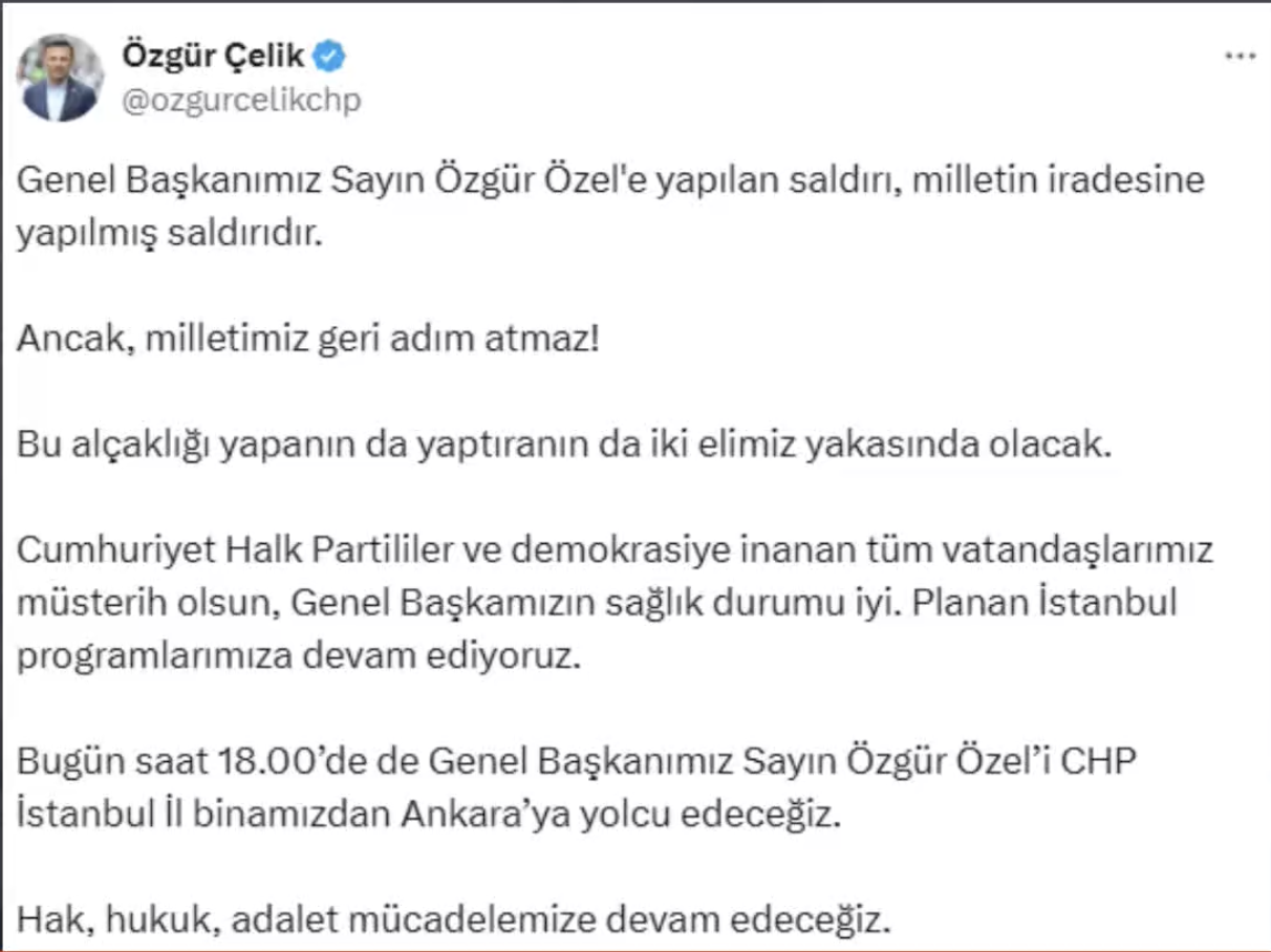 „Cumhuriyet Halk Partisi Genel başkanı Özgür Özel’in bugün katıldığı darp edilmesi ile ilgili soruşturma olup eylemi gerçekleştiren şahıs yakalanarak gözaltına alınmıştır. Ayrıntılı soruşturma devam etmektedir. Gelişmelerden bilgi verilecektir“