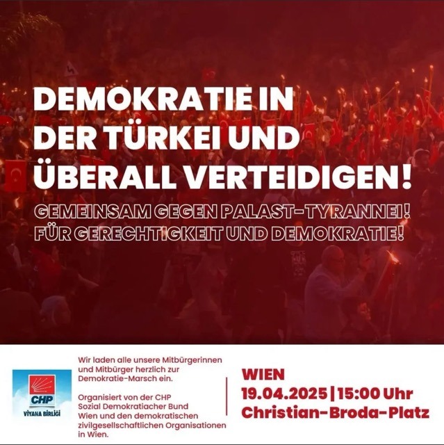 VİYANA.CHP Viyana Sosyal Demokrat adlı derneğin bugün Viyana’da saat 15:00’te organize ettiği, Türkiye’deki demokratik gelişmelerden duyulan büyük kaygı ve Cumhurbaşkanı adayı, İstanbul Belediye Başkanı Ekrem İmamoğlu’nun iktidar tarafından görevden alınmasını ve hapse atılmasını protesto etmek için düzenlenen mitingin afişlerinde Almanca şu ifadeler yer alıyor: “ “Türkiye’de ve her yerde demokrasiyi savunmak”, alt başlığı ise: “Sarayların zulmüne karşı hep birlikte! Adalet ve demokrasi için!“