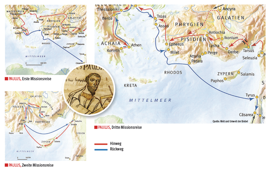 Geboren wurde er in Tarsus, einer kleinen Stadt an der Südküste der heutigen Türkei, wahrscheinlich im Jahr 10 n. Chr. In Jerusalem absolvierte er sein Studium. Schon früh unternahm Paulus einige Missionsreisen in Kleinasien, Griechenland, Makedonien und auch auf Zypern, was nicht zuletzt zu seiner Verhaftung in Jerusalem führte. Er verbrachte einige Zeit im Gefängnis in Cäsarea am Meer und wurde schließlich in Rom hingerichtet. Dies ist die verkürzte Lebensgeschichte des Apostels Paulus.