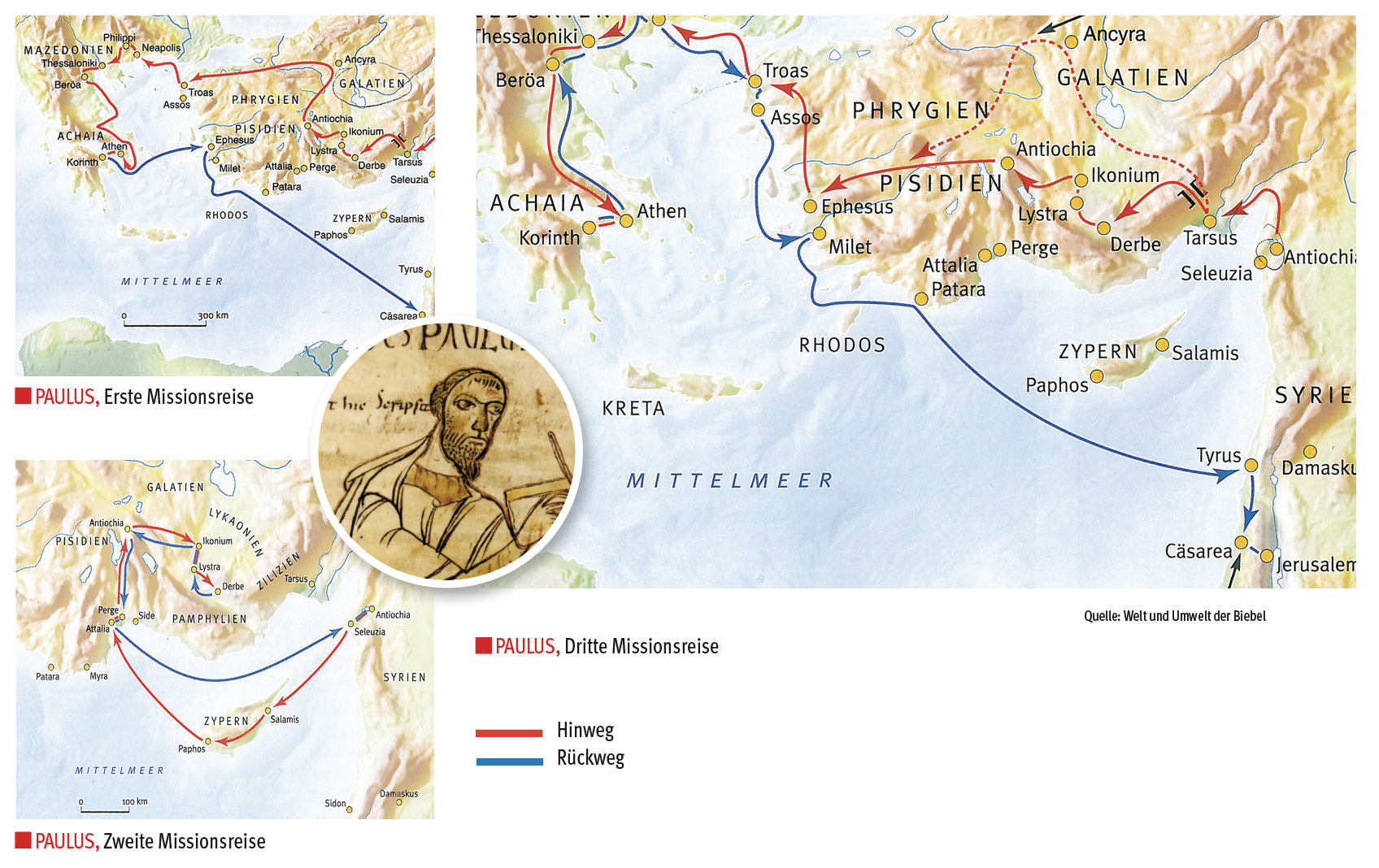 Geboren wurde er in Tarsus, einer kleinen Stadt an der Südküste der heutigen Türkei, wahrscheinlich im Jahr 10 n. Chr. In Jerusalem absolvierte er sein Studium. Schon früh unternahm Paulus einige Missionsreisen in Kleinasien, Griechenland, Makedonien und auch auf Zypern, was nicht zuletzt zu seiner Verhaftung in Jerusalem führte. Er verbrachte einige Zeit im Gefängnis in Cäsarea am Meer und wurde schließlich in Rom hingerichtet. Dies ist die verkürzte Lebensgeschichte des Apostels Paulus.