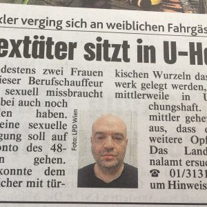 Son kurbanının ihbarından kısa bir süre sonra yakalanan zanlının, 2010 ve 2011 yıllarında iki kadına daha cinsel istismarda bulunduğu belirtiliyor. Polis, daha fazla kurban olması ihtimali üzerinde duruyor ve devam eden soruşturmaya yardımcı olabilecek her türlü bilgi için 01-31310-33 800 numaralı telefondan Viyana Polis Teşkilatı ile irtibata geçilmesini rica ediyor.