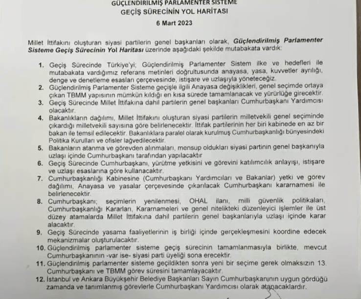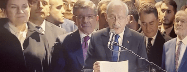 ANKARA. Saadet Partisi Genel Merkezi’nde bir araya gelen Altılı Masa toplantısının ardından Millet İttifakı’nın Cumhurbaşkanı Adayının Kemal Kılıçdaroğlu olduğu açıklandı.İYİ Parti lideri Meral Akşener’in masaya geri dönüşüyle tekrar kurulan altılı masa bugün, cumhurbaşkanı adayını konuşmak üzere toplandı. Altılı masa liderlerinin Saadet Partisi Genel Merkezi’nde yaptığı toplantı sona erdi. Görüşme sonrası Millet İttifakı’ndan beklenen açıklamada cumhurbaşkanı adayının Kemal Kılıçdaroğlu olduğu açıklandı.
