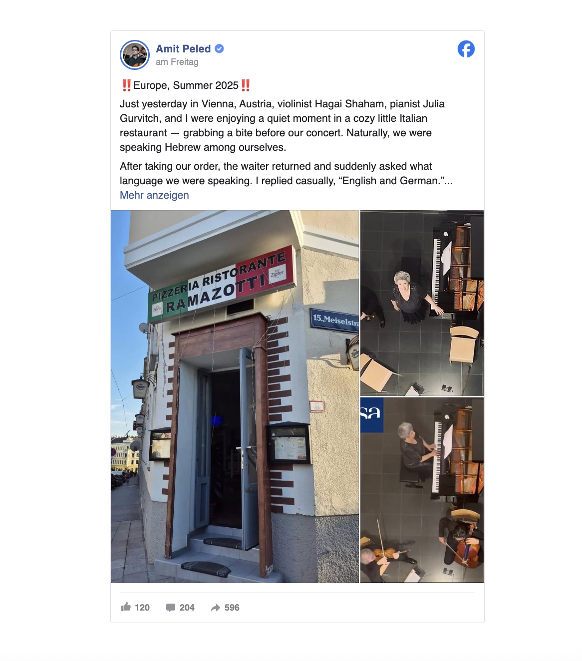 „Der hier zur Diskussion stehende Vorfall hat eine signifikante Resonanz in den sozialen Medien erfahren. Der israelische Cellist Amit Peled berichtet auf Facebook von einem Vorfall, der sich in der vergangenen Woche in einer Pizzeria in Wien zugetragen hat. Nach Aussage des Musikers wurde er gemeinsam mit seinen Kollegen von dem Servicepersonal als hebräischsprachig identifiziert und daraufhin aus der Lokalität verwiesen. Gemeinsam mit dem israelischen Geiger Hagai Shaham und der aserbaidschanisch-israelischen Pianistin Julia Gurvitch habe er demnach in dem Lokal in der Meiselstraße in Wien-Fünfhaus vor einem Konzert in der Alten Schieberkammer auf der Schmelz eine Mahlzeit zu sich nehmen wollen. Nach Eingang der Bestellung sei der Kellner zurückgekommen und habe erfragt, welche Sprache von den Gästen gesprochen werde. Daraufhin forderte er die drei auf, das Lokal zu verlassen und erklärte, dass er ihnen kein Essen servieren würde. In seinem Facebook-Posting äußerte der Musiker auch Kritik an der Reaktion der anderen Gäste. Die Reaktionen der anderen Personen auf den Vorfall waren demnach erschrocken. Abgesehen von vereinzelten mitfühlenden Blicken gab es keine weiteren Reaktionen. Die Protagonisten kehrten zu ihren kulinarischen Genüssen, ihren Gesprächen und ihrem Wein zurück, als sei der Zwischenfall völlig spurlos an ihnen vorbeigegangen.“
