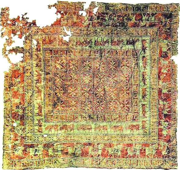 Er wurde 1949 von Archäologen in einer Grabkammer eines Königs in Sibirien gefunden und war aufgrund von Kälte und Eis noch in einem guten Zustand. Der 183×200 cm große Teppich ist nicht nur auffallend dicht geknotet, sondern hat auch sehr interessante Motive. Der Pazyryk zeigt zum größten Teil Elemente aus der Mathematik, wie geometrische Muster und Zahlen, aber auch Pflanzen, Tiere und Krieger, die auf Pferden in den Kampf reiten. Falls Ihnen ein Bild nicht ausreicht und Sie dieses Meisterwerk der Teppichknüpfung mit eigenen Augen sehen wollen, ist das im „The State Hermitage Museum“ in St. Petersburg in Russland möglich. Laut Experten ist die Teppichknüpfkunst auf die nomadischen Türkvölker in Asien zurückzuführen. Diese nutzten den Teppich anfangs zum Isolieren ihrer Hütten, da er die Wärme dämmte und so Schutz vor kalten Nächten bot.